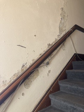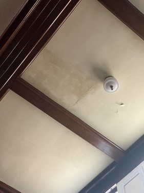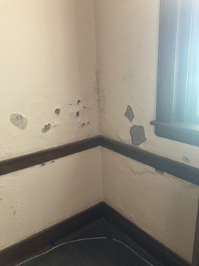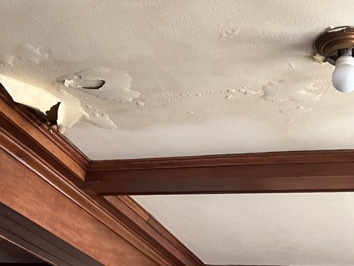 We have struggled to stay ahead of the leaks but have also had issue with the latest roof repairs dating to 2016. Hail storms since then have damaged many roof tiles, allowing the rain to get to the underlayment and work its way through the cracks. As you can see here, the damage is most notable in the falling paint found in various locations around the church. We are concerned that extended water penetration will cause more significant damage if not addressed.