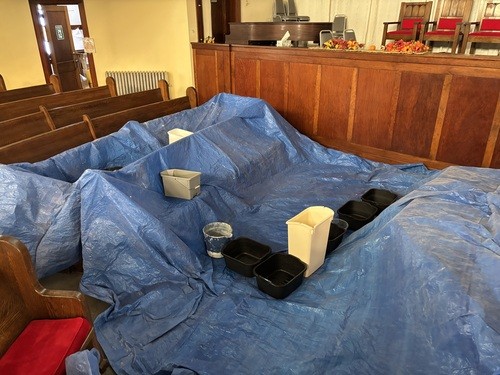 Unfortunately, for a number of years we have been facing challenges with leaks in the roof. Many partial repairs have been done in the past to stop rainwater from damaging the ceiling of the sanctuary and various interior and exterior walls. These leaks have occurred from time to time for years. The recent heavy snowstorm opened up a new hole and introduced our biggest leak to date, raining down gallons of water into the sanctuary.
